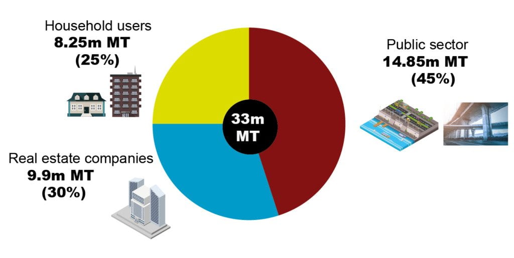 The public sector is the main buyer using almost half of the 33 million tons of cement sold per annum. A driving force behind the 12-15% year-on-year growth for the cement industry.