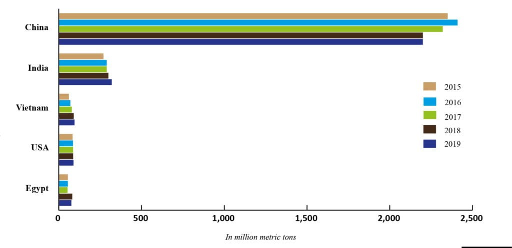 In 2019, the worldwide total volume of cement production was 4.2 billion metric tons. Of the total production, China produced more than 50% or 2,200 million metric tons. India, the 2nd largest cement producer of the world manufactured 320 million metric tons during the same period.