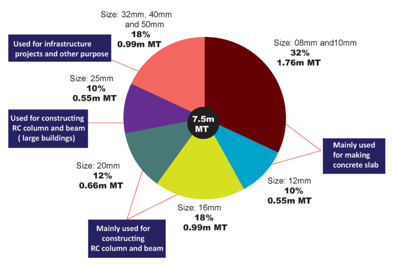 Products of 10mm, 12mm and 16mm size have the most demand in Bangladesh accounting for 58% of total rebar used. Other most selling sizes of rebar include 20mm and 25mm which also have sizeable demand especially for constructing high rise commercial buildings and government infrastructural projects.