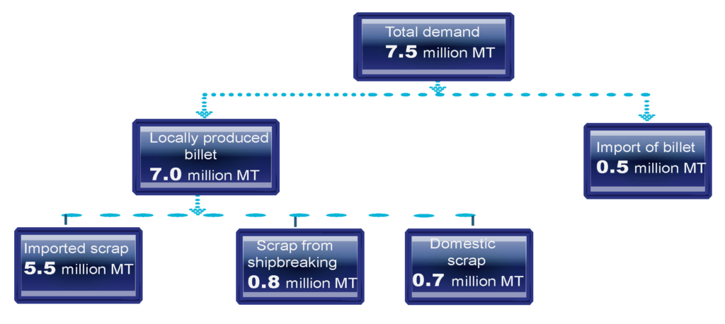 Bangladesh steel industry has experienced around 10% to 15% growth per annum leading to total demand of 7.5 million MT in the last fiscal year. The country is also one of the largest importers of Scrap, Sponge and Pig iron – understood to be 2nd largest scrap importer in South East Asia and 4th in as a whole Asia region.