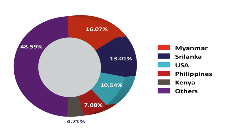 During the 2018-2019 fiscal year, almost half (48.59%) of the US$ 129.95 million export earnings of pharmaceutical products generated from five countries – Myanmar, Sri Lanka, USA, Philippines, and Kenya. Myanmar was the biggest buyer during the same period as 16.07% of total drug exports ending there.