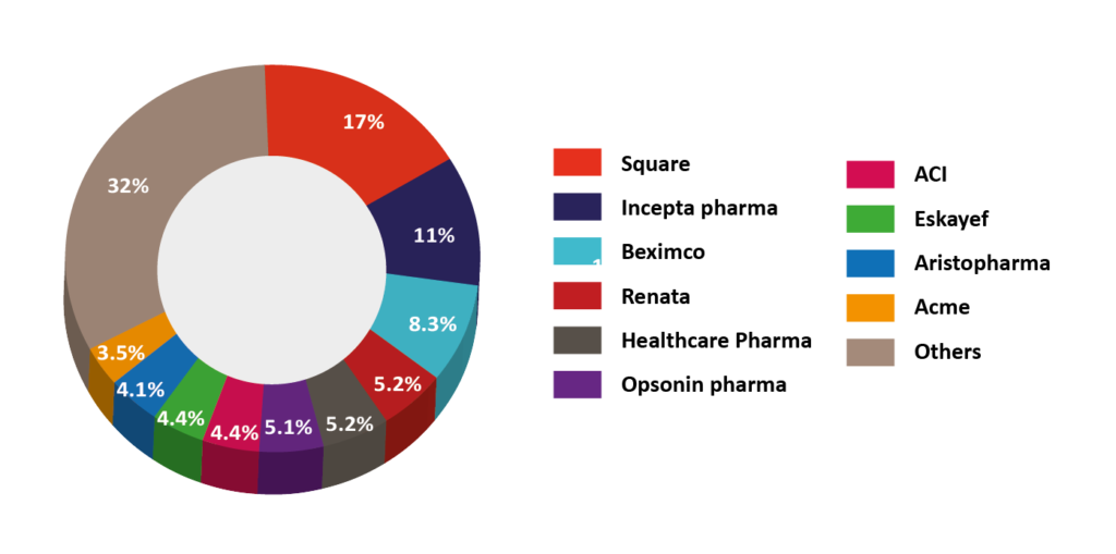 Square Pharmaceuticals Ltd – a flagship concern of Square Group – is the leading manufacturers. With a local market share of 17%, it has been exporting antibiotics and other pharmaceuticals to 42 countries since 1987. The company reported having a turnover of BDT 50.87 billion during the 2018-19 FY with an annual growth of 10.85%.