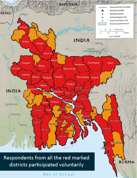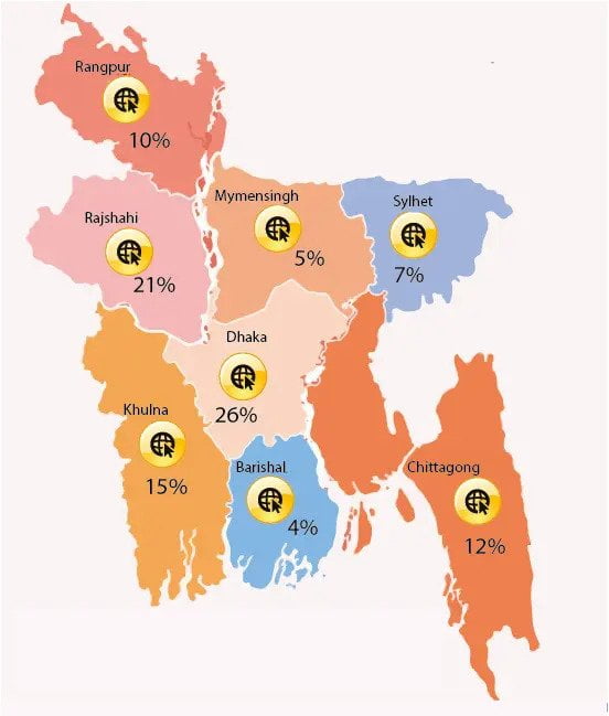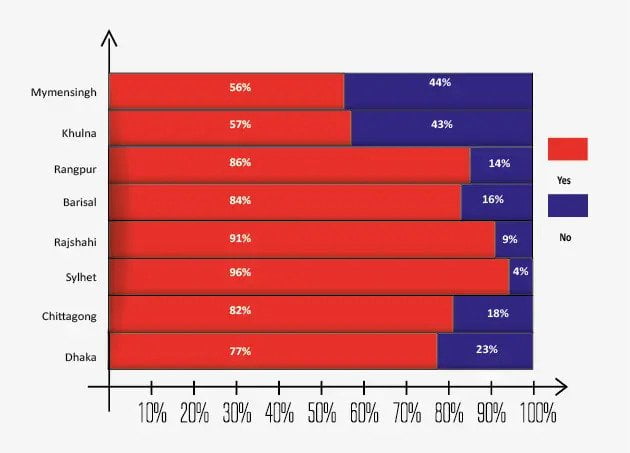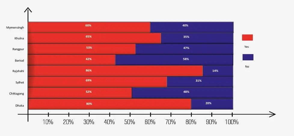 Our survey findings suggest that majority of the people across all eight divisions of Bangladesh earn less than BDT 40,000 (472 USD) in a month. The number of middle-income groups, on the other hand, is rising not only in Dhaka but also in Sylhet, Khulna, and Mymensingh – an indication that prosperity is spreading due to regionalised economic activities.