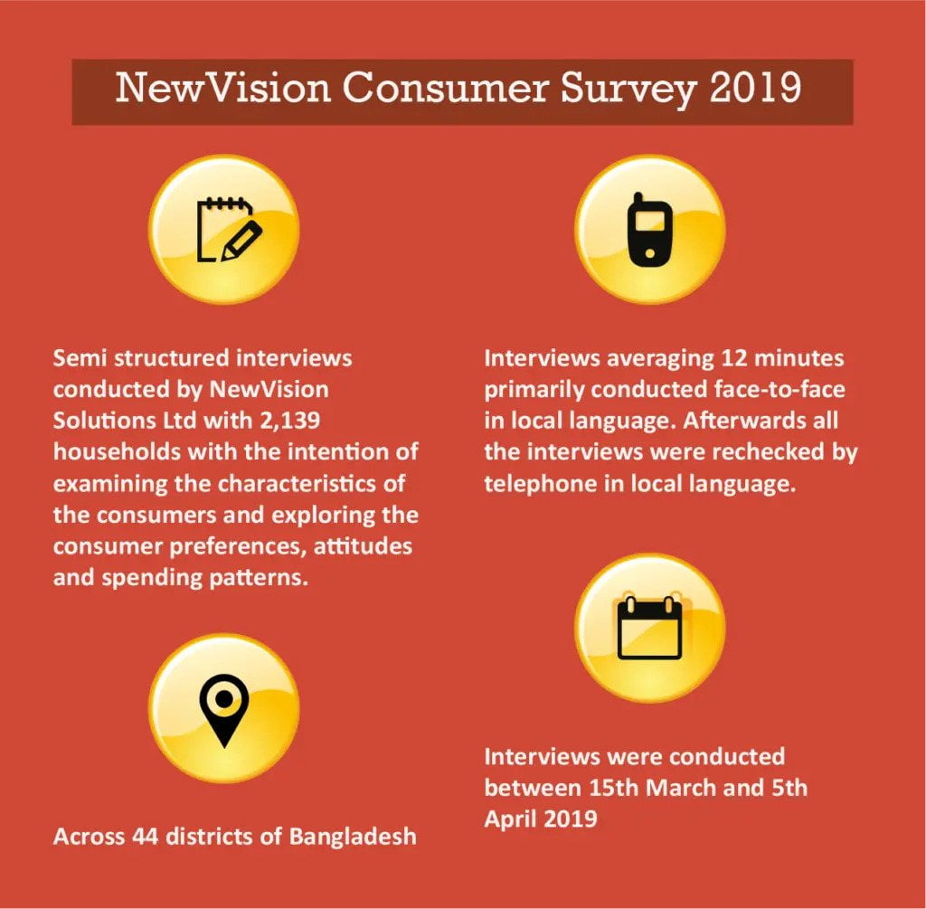 To examine the characteristics of the consumers and explore the consumer preferences, attitudes and spending patterns of the consumers in the country of miraculous growth, NewVision Solutions Ltd. surveyed 2,139 households from 44 districts of Bangladesh during March and April of 2019.