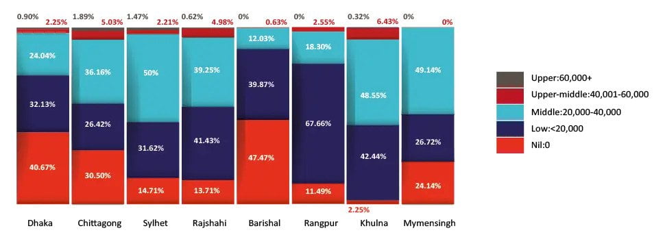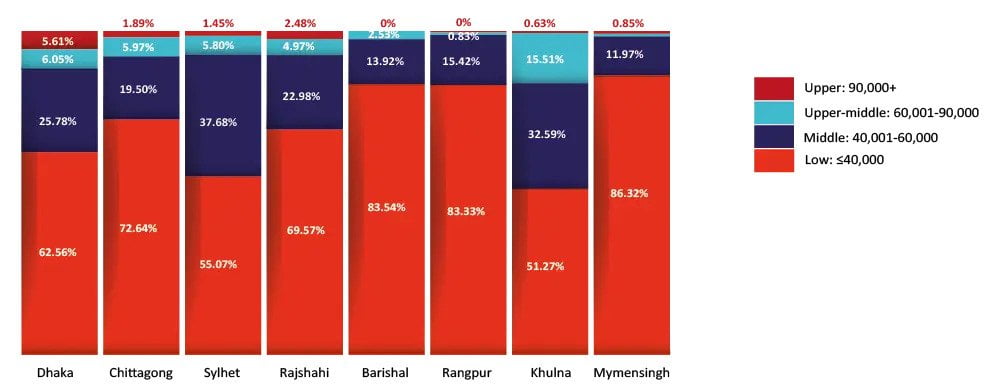 upper-middle, referring to those with income between BDT 40,000 and BDT 60,000 and upper, earning more than BDT 60,000. It can be seen that in all of the divisions, the majority of people earn below 40,000 BDT in a month.