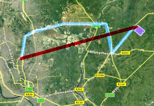 Red line indicates the main bridge over the Padma river
