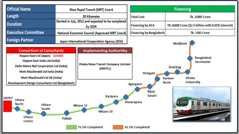 Dhaka elevated Metro Rail project was undertaken by the Ministry of Road Transport and Bridges – supported by JICA – to reduce traffic congestion in Dhaka city. Also known as MRT-6, would be 20km long starting from Uttara to Motijheel consisting of 16 elevated sections. MRT-6 is getting constructed in an environment-friendly manner for having noise barriers and vibration-free tracks.